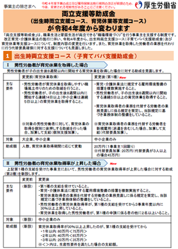 「両立支援等助成金(出生時両立支援コース、育児休業等支援コース)が令和4年度から変わります」