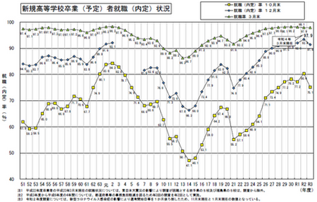 文科省発表 この春に卒業の高校生 就職内定状況(3月末日現在)