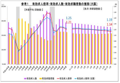 3. 2月平均有効求人倍率2か月ぶり上昇 大阪は7か月連続低下も求職者は増加