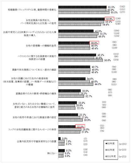 「女性従業員の採用拡大・正社員登用」が50%近くで