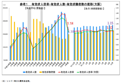 3. 10月 全国有効求人倍率1.15倍 大阪は前月と同倍率で推移