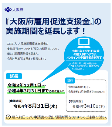 「大阪府雇用促進支援金」 2022年1月26日 最新情報