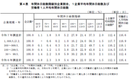 ・労働者1人平均年間休日総数 116.6日(前年調査:116.4日)